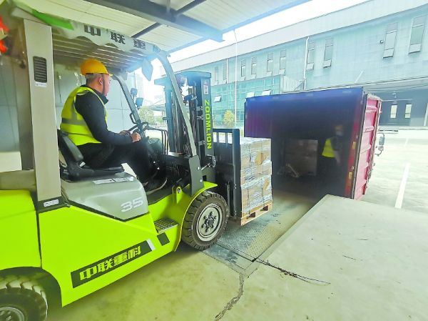 工作人员操作叉车,将货物逐一卸下。