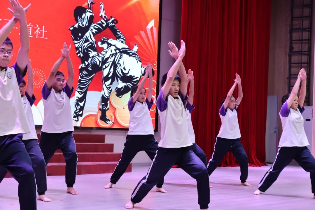 紧接着,精彩绝伦的节目表演正式拉开大幕。体育舞蹈社的同学们带来活力四射的开场舞,瞬间点燃现场气氛。教务处带来的诗歌朗诵《教育之光,耀我南高》,深情展现教育的力量。总务处、食堂和物业团队以《后勤不后,我行我秀》彰显默默奉献的精神。学工处和宿管团队的《相亲相爱一家人》唱出校区大家庭的温暖。逐峰空手道社团的表演尽显青春活力。此外,团委的三句半、兵教师的擒敌拳、曲韵风华社的川剧变脸等节目也各具特色,将现场气氛一次次推向高潮,赢得台下观众的阵阵掌声与喝彩。