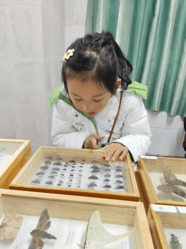 昆虫标本馆里,小小南高人欣赏着鬼斧神工的杰作——金龟子安稳地卧在绒布上,背甲竟流淌着祖母绿般的华光,仿佛幽深地层里凝结的一滴宝石泪;蝴蝶张开翅膀仿佛要一跃而起,斑斓色泽却凝固于永恒的寂静里。