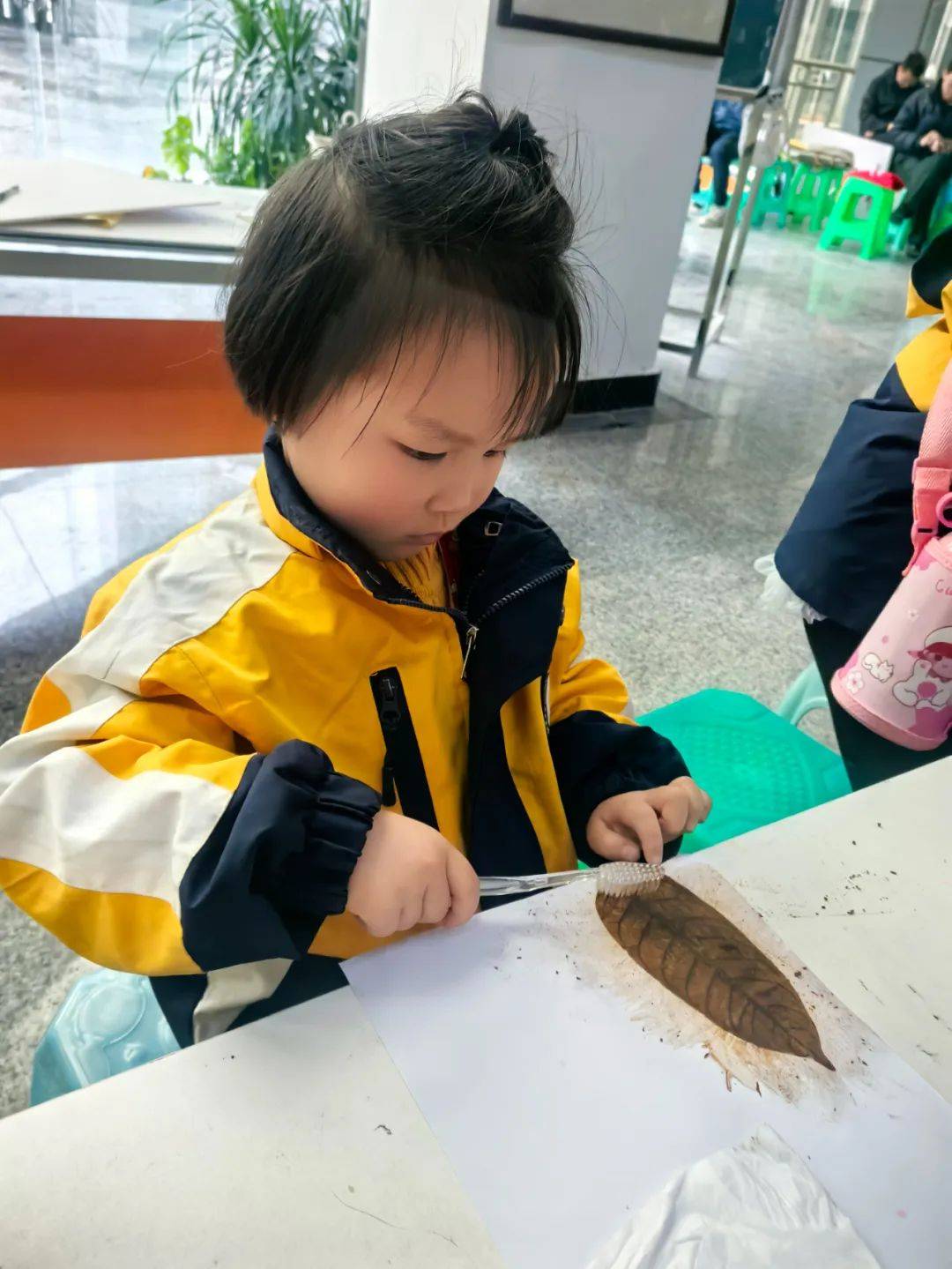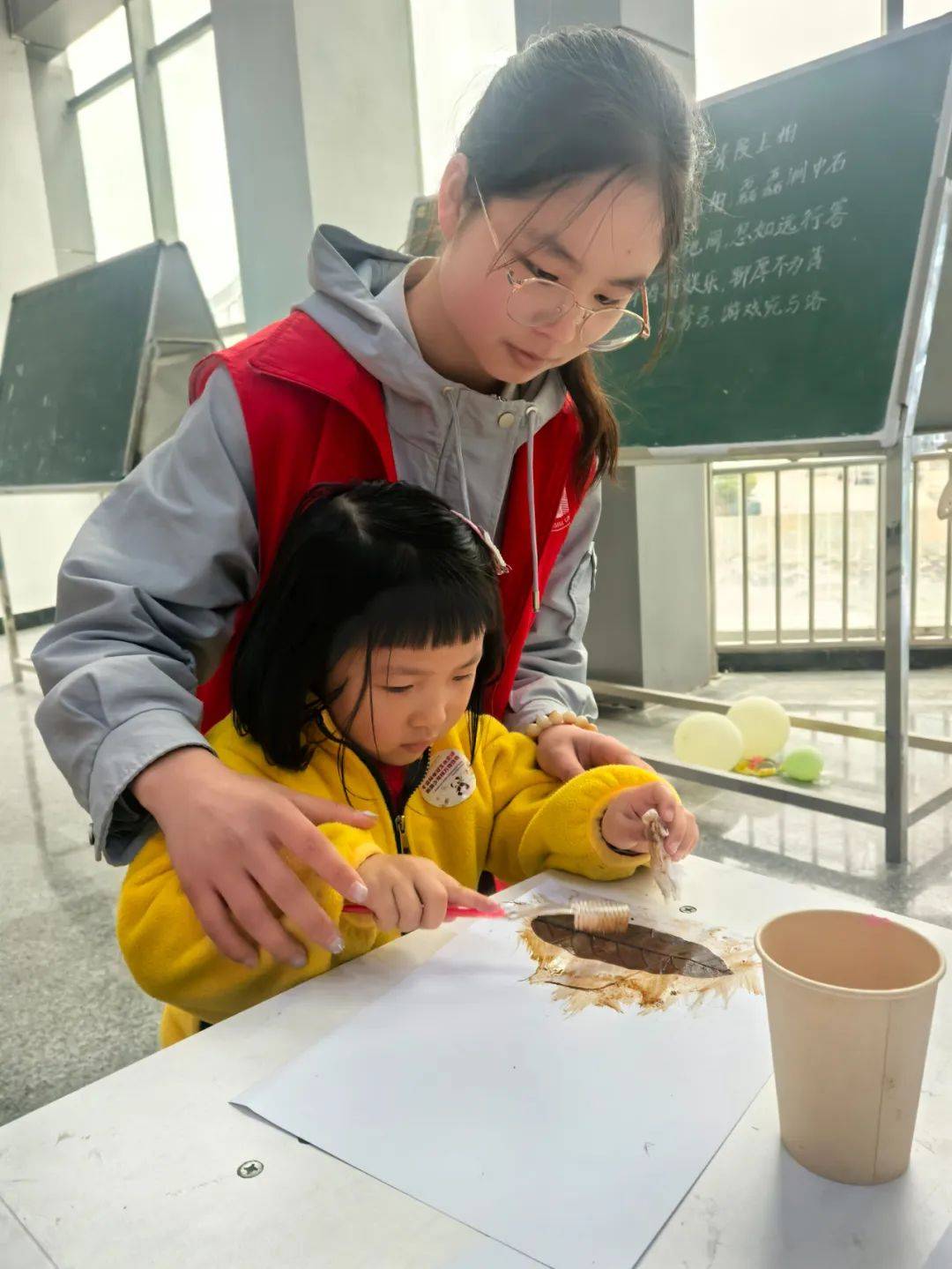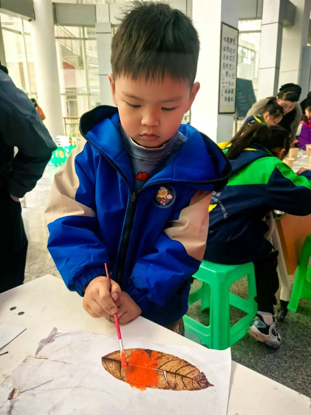 在西华师大叶脉书签制作区,孩子们屏息凝神地用牙刷清理叶片脉络,将靛蓝浸入叶脉沟壑,树脂般的脉络瞬间化作冰川裂隙。志愿者穿梭其间,看小小南高人把叶脉染成星空、朝霞与极光:“老师,我把秋天藏进书页啦!”
