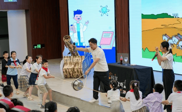 科技辅导员还为小小南高人带来精彩纷呈的趣味实验秀——孩子们目睹维C药片让紫甘蓝汁瞬间褪色的化学魔术,惊叹三米高的“大象牙膏”泡沫喷涌;真空马德堡半球拔河赛让二十名孩子亲身体验大气压力,而液氮实验区更充满惊喜:冻碎的玫瑰化作冰晶,喷发的烟圈如飞碟掠空,现场制作的液氮冰淇淋则让科学之味融入欢声笑语。这场实验秀将抽象的科学原理转化为可触可感的奇妙体验,点燃了孩子们的科学热情。