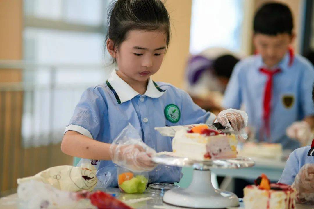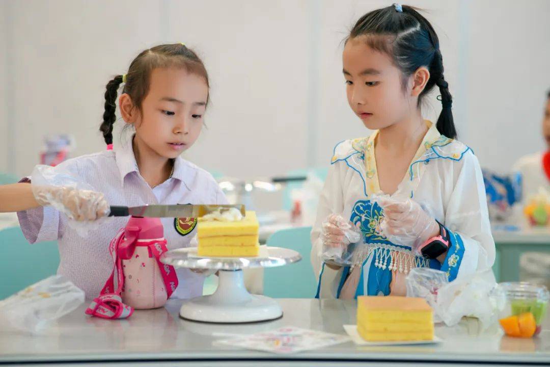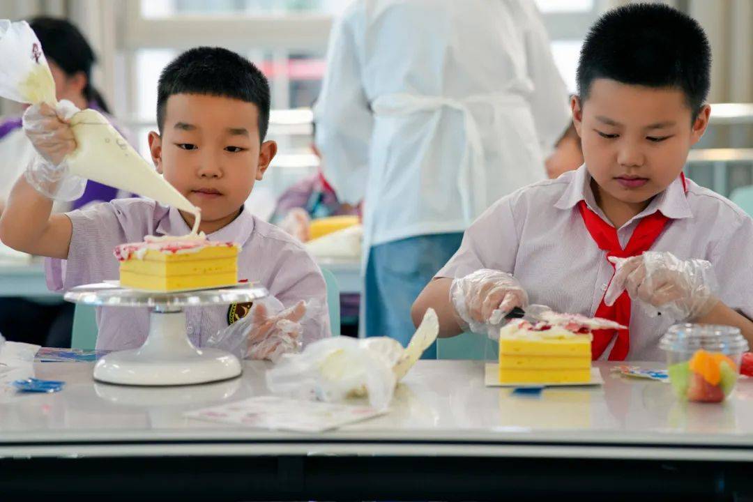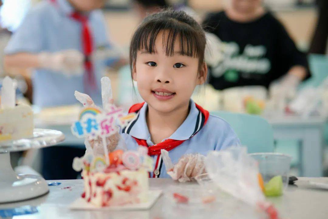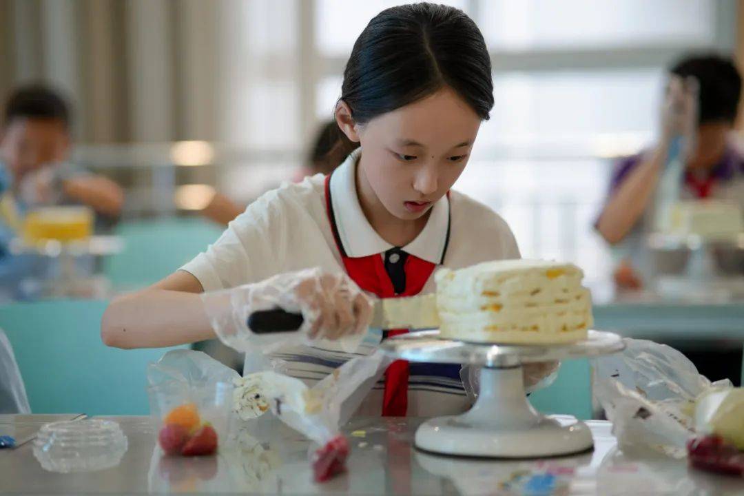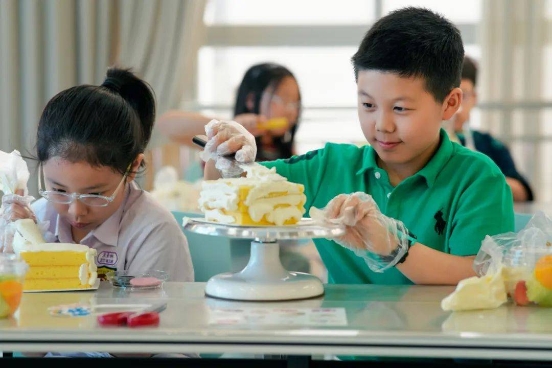 在可香蛋糕专业烘焙师的引导下,80名“小小南高人”在南充市青少年活动中心创意工坊分工协作,从蛋糕胚塑形、奶油裱花到水果拼搭与巧克力装饰,展开一场“从科学到美学”的沉浸式劳动实践,让“协作、创新、担当”的种子在南高新生代心中扎根生长。