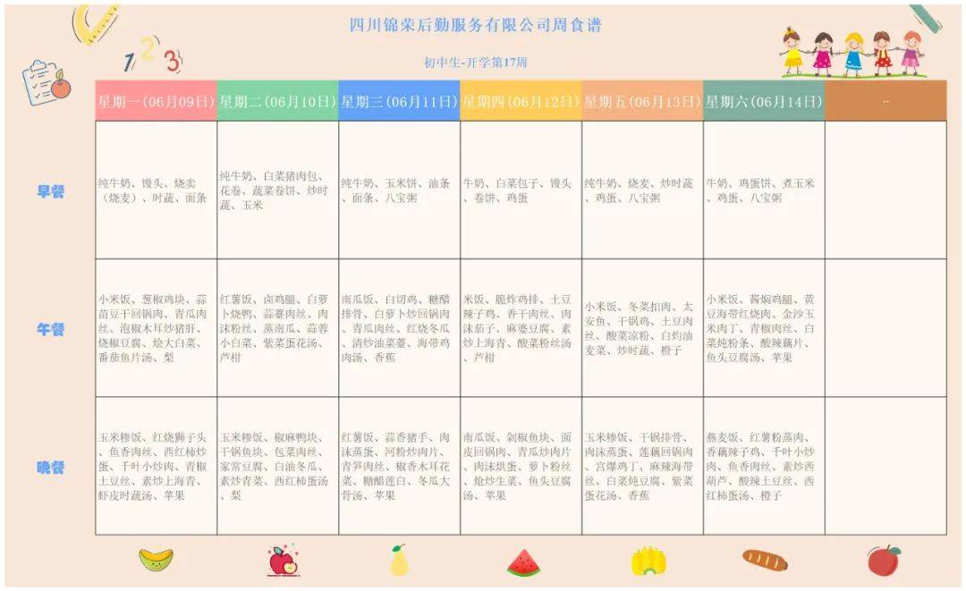 第十七周 营养食谱 南充高中临江校区 “清泉右绕,舞凤左翔”,南充高中临江校区有清泉轩、舞凤轩两个学生食堂,为学生提供营养均衡、菜品丰富的膳食保障。食堂开设免费加饭加菜窗口,实行值日干部和值周老师陪餐制,让同学们吃得饱,更吃得好!一起来看看南充高中临江校区食堂第十七周为同学们准备了哪些美味吧! 第十七周食谱 营养配比 食堂管理 菜品实拍 快乐“食”光 供稿:临江校区总务处 终审:陈祺文