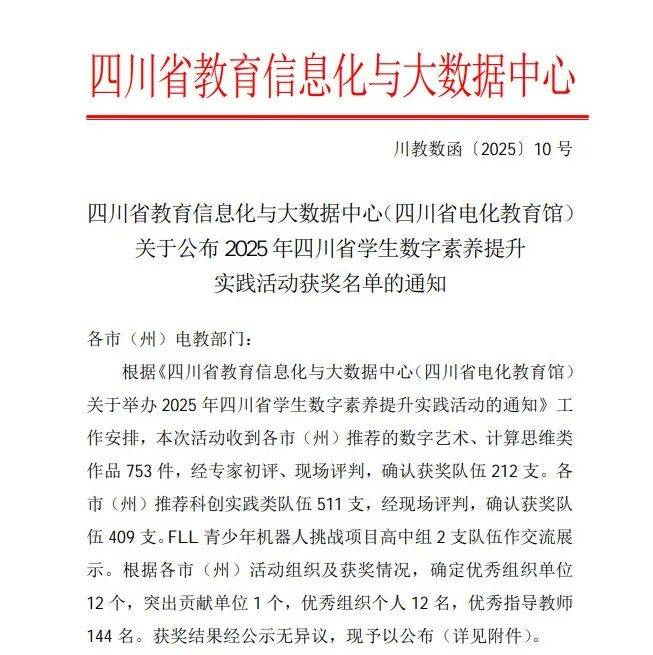 在近日公布的四川省学生数字素养提升实践活动省级赛事评选结果中,南充高中展现出强劲的综合实力,共有13 支参赛队伍斩获省级奖项,成为四川省内本次赛事中获奖队伍数量最多的学校,本次赛事涵盖数字艺术、计算思维、科创实践类三大领域,在22个子项目中全省数百所中学参与角逐。南充高中参赛团队凭借扎实的知识储备、创新的思维模式及默契的协作能力,在737支队伍、近1400名学生中脱颖而出。其中,4人晋级国赛,10人获全省一等奖,6人获全省二等奖,9人获全省三等奖。总获奖数和一等奖获奖数均为全省第一。鄢然、李小凤、冉潇琦老师获评四川省优秀指导教师。