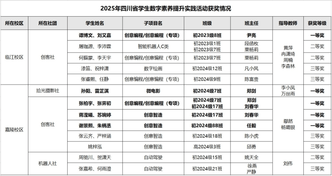 南充高中临江校区创客社2名学生获一等奖,4名学生获二等奖,4名学生获三等奖。南充高中嘉陵校区拾光摄影社2名学生获一等奖。嘉陵校区创客社6名学生获一等奖,3名学生获三等奖。嘉陵校区机器人社2名学生获二等奖,2名学生获三等奖。