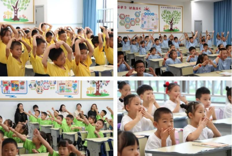 音乐响起,小手拍拍!小朋友们坐在课桌前,跟着节奏点点头、扭扭腰、伸伸臂,像一群快乐的小音符。整齐的动作,甜甜的笑容,整个教室都变成了欢乐的海洋!