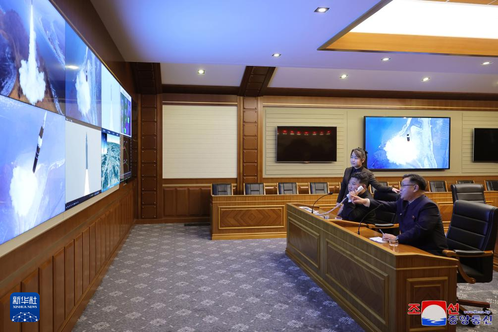 这是朝中社发布的金正恩(中)通过视频监控系统观看导弹试射活动的画面。新华社/朝中社