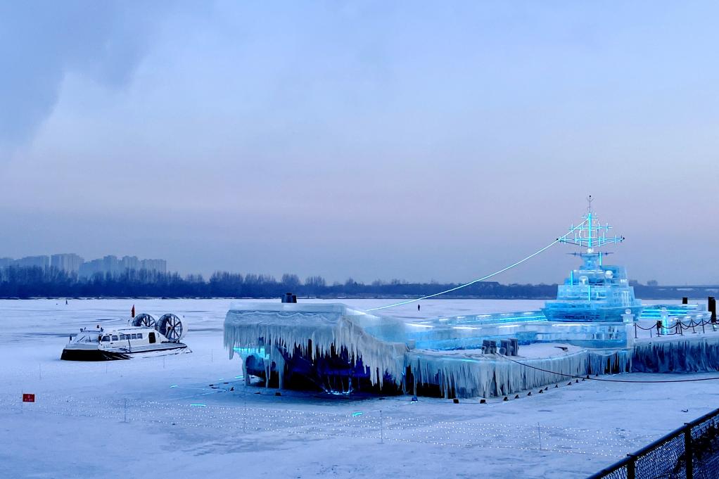 新华社哈尔滨1月8日电(记者杨思琪、刘赫垚)进入冰雪季,中国“冰城”哈尔滨的冰雪景观连连“上新”。近日,一艘用冰打造的大型航母景观在松花江区域落成,在社交媒体迅速走红,吸引不少市民、游客争相“打卡”。