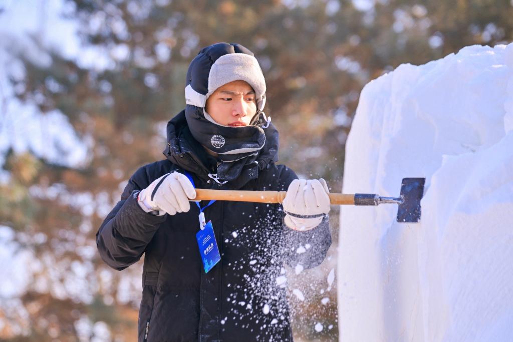 在哈尔滨工程大学校园内,一名大学生雪雕选手进行创作(1月5日摄)。新华社发