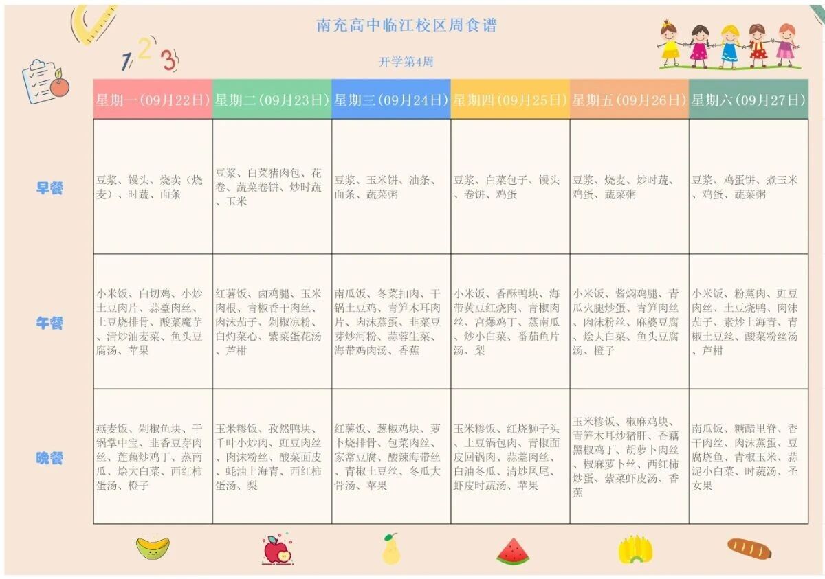 “清泉右绕,舞凤左翔”,南充高中临江校区有清泉轩、舞凤轩两个学生食堂,为学生提供营养均衡、菜品丰富的膳食保障。食堂开设免费加饭加菜窗口,实行值日干部和值周老师陪餐制,让同学们吃得饱,更吃得好!一起来看看南充高中临江校区食堂第四周为同学们准备了哪些美味吧!